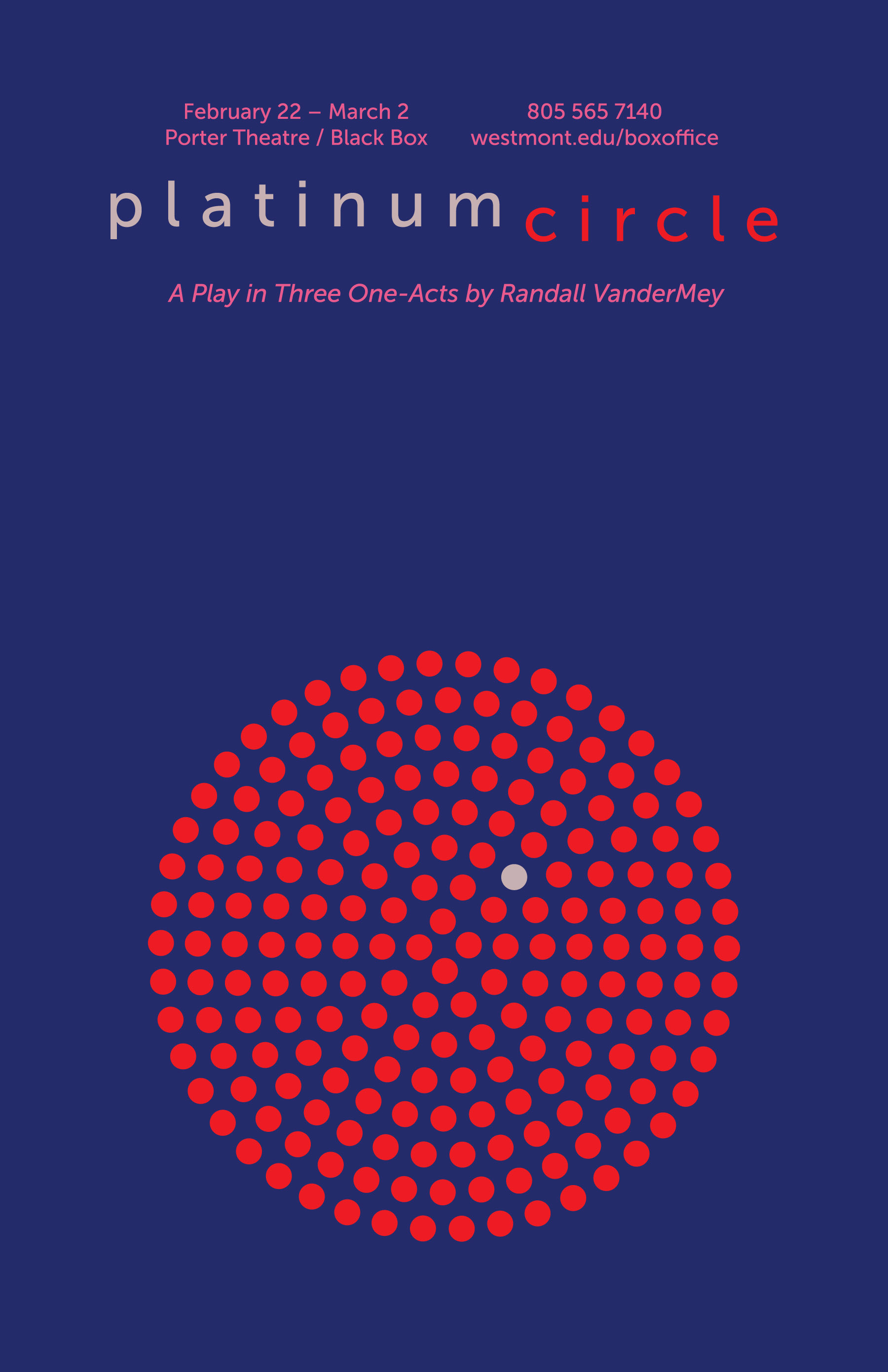 John Blondell, Westmont professor of theatre arts, directs a world premiere, “Platinum Circle: A Play in Three One-Acts,” Feb. 22-23 and 28, and March 1-2, 8 p.m. in Westmont’s Porter Theatre. Tickets are $7 for students and seniors, $10 for adults, and can be purchased online at westmont.edu/tickets or by calling (805) 565-7140.