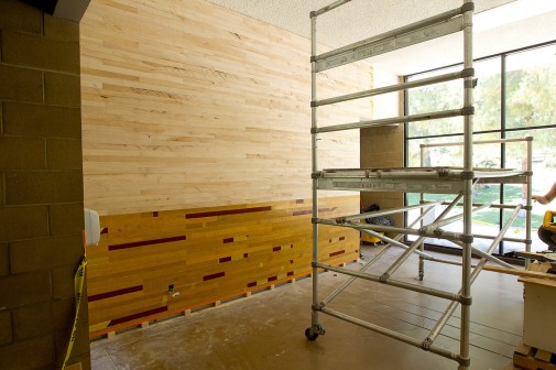 Workers are busy modernizing the lobby of Westmont’s Murchison Gym, upgrading the lighting, ceilings and walls, and installing two, 70-inch monitors to show video and photos of Westmont Hall of Fame athletes and other information. Maple hardwood flooring, dating back to the construction of the gym in the late 1960s, was removed during a 2008 renovation and has been recycled for use on the lobby walls.
