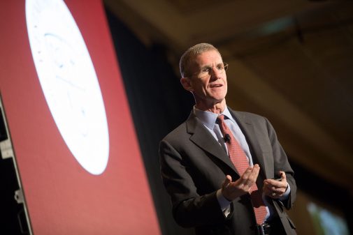 General Stan McChrystal addressed more than 700 people at Westmont’s 12th annual President’s Breakfast in the Fess Parker Grand Ballroom on March 3. Later that morning, he fielded questions from four Westmont students during convocation on campus, speaking to about a thousand people. At both events, he discussed challenges presented by the rapid pace of technology, globalization and our increasingly complex society.