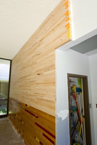 Workers are busy modernizing the lobby of Westmont’s Murchison Gym, upgrading the lighting, ceilings and walls, and installing two, 70-inch monitors to show video and photos of Westmont Hall of Fame athletes and other information. Maple hardwood flooring, dating back to the construction of the gym in the late 1960s, was removed during a 2008 renovation and has been recycled for use on the lobby walls.